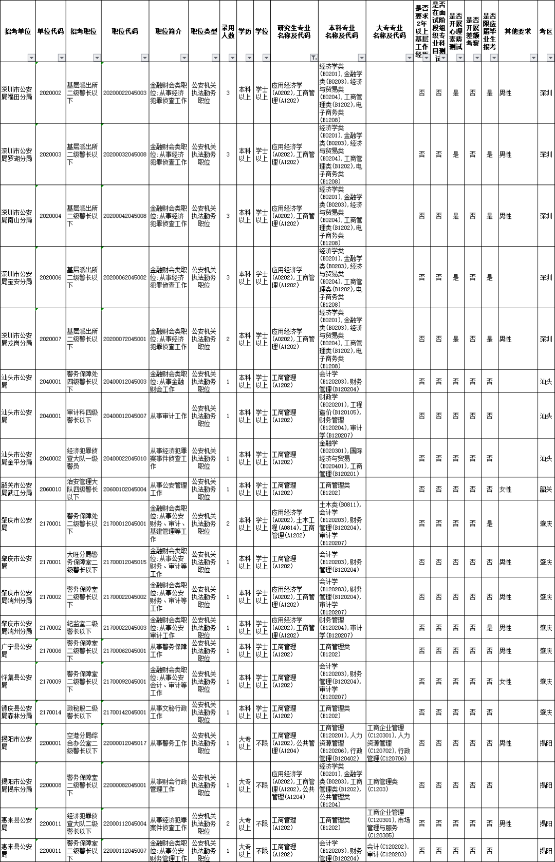 广东省各级公安机关2020年考试录用公务员职位表