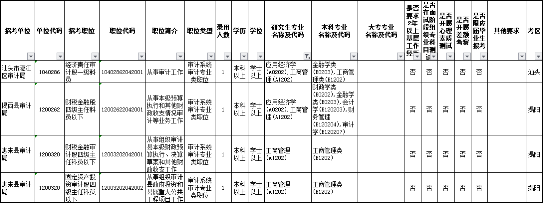 广东省各级审计机关2020年考试录用公务员职位表