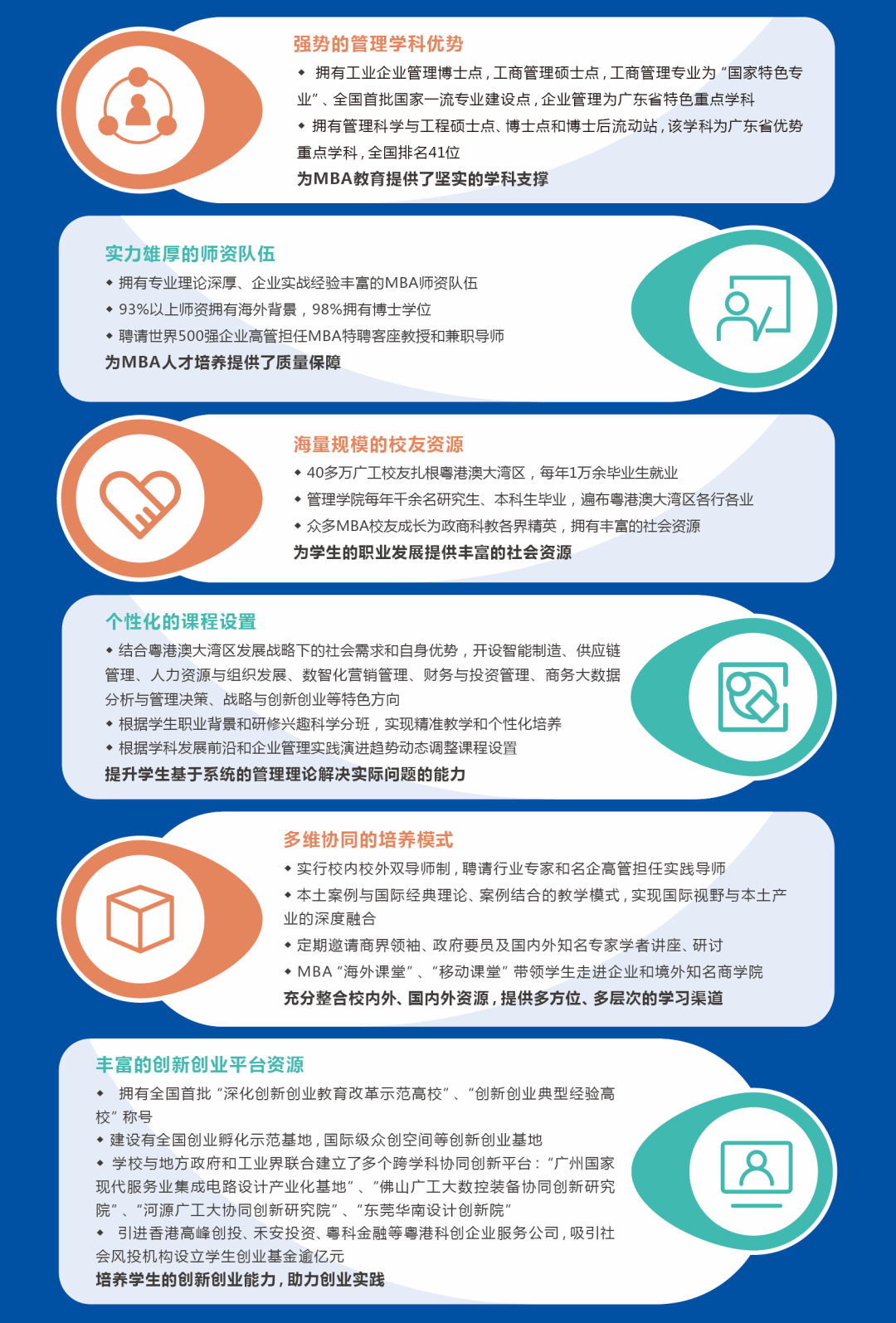 近年来学校投入大量资源,努力打造华南地区优质MBA教育品牌,升级办学环境、大力引进优秀师资,专职教师共150人。2017-2020年,学院共招收MBA学生1113名,并根据学生所在行业、岗位情况及职业发展需求,系统科学地设置了个性化的人才培养方向,包括:智能制造、供应链管理、人力资源与组织发展、数智化营销管理、财务与投资管理、商务大数据分析与管理决策、战略与创新创业(*睿德创新班)。秉承“学以致用,创新为魂”办学特色,十七年来广工MBA为华南地区培养了大批商界精英,连续多年被中国MBA联盟评为“特色商学院”,社会影响力和品牌价值快速提升。